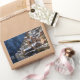 Vinheta-foto retangular com as fachadas das casas de madeira ao lado do lago de Hallstätter See sob uma camada de neve fresca no inverno em Hallstatt, Áustria.