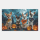 Libere o espírito assustador com esta design sombria do Dia das Bruxas apresentando um bando de cachorros sob um céu escuro e iluminado, cercado por morcegos voadores e abóboras brilhantes. Perfeito para aqueles que amam um toque de diversão terrível com seus amigos peludos!