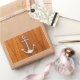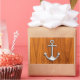 Um cromo prateado como um design de âncora em um decor de fundo de madeira de madeira de madeira de madeira de teak. Um presente náutico moderno. Use o link "Perguntar a este Designer" para entrar em contato conosco com suas solicitações especiais de design ou para obter assistência com qualquer das suas necessidades de personalização.