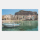 Um autocolante de fotografia retangular com dois barcos no antigo pequeno porto de Cefalu, uma cidade antiga com casas tortas na margem e uma pequena praia de cidade na costa norte da Sicília, ilha italiana.