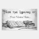 Este livreto personalizado tem espaço para o seu nome e arte de livros antigos e uma velha pena escrevendo em antigas artes gravadas em um fundo falso de cinza granulada, O topo lê Da Biblioteca de em velhas letras góticas em inglês. Você pode personalizar este adesivo para alterar fontes ou cores de fundo, até mesmo salvar seu design para mais tarde.