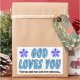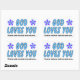 Deus te ama para sempre e sempre... Esta é uma bela imagem cristã de um excelente que diz escrito com letras azuis e contorno preto. Há duas flores azuis e roxas no design. Design de propriedade por Diligent Heart