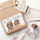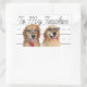 Estes adesivos apresentam uma fotografia de dois cães sorridentes que recuperam ouros que estão vestindo gravatas e óculos de nerd. O fundo é uma folha de papel folgado com as palavras "Para o meu professor" escrita em letra cursiva.