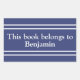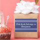 Este adesivo azul tem duas faixas brancas acima do texto e duas faixas brancas abaixo das palavras. As letras brancas se leram "Este livro pertence a" e há um lugar para o nome do destinatário.