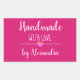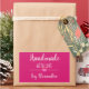Um adesivo moderno "feito à mão com amor" com uma fonte branca sobre um fundo de papelão embelezado por um coração. Personalizar texto.