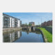 Uma fotografia brilhante e de alta resolução que captura o moderno desenvolvimento à beira-mar ao longo da Navegação Calder & Hebble em Wakefield. A imagem mostra um grande complexo de apartamentos revestido de branco e madeira com varandas de vidro, perfeitamente espelhado na água parada do canal. Em meio-termo, as estruturas de pedra da eclusa de Fall Ings e uma ponte para pedestres são visíveis, colocadas contra um pano de fundo de habitações de tijolo vermelho e um céu claro. Esta perspectiva enfatiza a renovação urbana bem-sucedida das docas históricas de Wakefield.