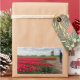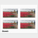 Um autocolante de fotografia retangular, com um agricultor a vestir sapatos de madeira amarelos a inspecionar as suas tulipas vermelhas, com no fundo um moinho de vento tradicional em primavera, na Região do Bulbo das Flores, nos Países Baixos.