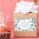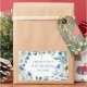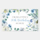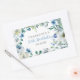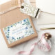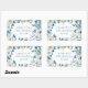 Flores brancas e alegres e folhas verdes de cor d'água formam uma bela borda em bonito adesivos azuis de festa de aniversário floral. Um guião moderno e manuscrito em um adesivo personalizado para seu brunch de jardim ou favoritos para festas de chá.