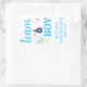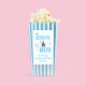 Adesivo de pipoca 'Equipe Menino' para uma festa de revelação do sexo. Design moderno em azul com uma cegonha entregando um bebê. Personalize com os nomes dos futuros pais e a data. Design coordenado em rosa com 'Equipe Menina' disponível na coleção. Caixa não incluída.