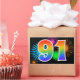 Este design de adesivo vibrante e divertido apresenta um padrão colorido inspirado em fogos de artifício celebratórios, juntamente com o número "91", tendo um padrão de gradação inspirado no arco-íris multicolor, sobre um fundo de cor preta. Os adesivos como este poderiam talvez ser usados numa festa que comemora o 90° aniversário de alguém, ou talvez para o 90° aniversário do primeiro casamento de um casal, ou algum outro evento de 91ruas. [~Z0000324]