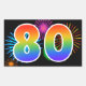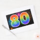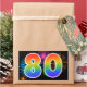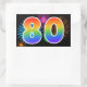 Este divertido e vibrante design de adesivo apresenta um padrão colorido inspirado em fogos de artifício comemorativos, juntamente com o número "80" apresentando um padrão de gradiente inspirado em arco-íris multicolorido, sobre um fundo de cor preta. Adesivos como este podem ser usados em uma festa comemorando o octogésimo aniversário de alguém, ou talvez para o octogésimo aniversário de casamento de um casal, ou algum outro evento de 80º.