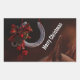 Belas varetas de Natal com uma foto com ferradura pendurada adornada com uma fita de xadrez de búfalo e decorações de Natal. O topo de uma cabeça e ouvidos de cavalos também em vista.