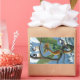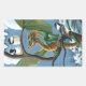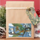 Um pequeno dragão verde numa árvore no inverno tentando fazer amigos com três galinhas.