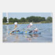 Op teenslippers 2 fubby poppetjes die een wedstrijdje op het water doen als een peddelboard. Actie en sportief in zomers beeld.