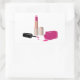 Obrigado, colantes com um design de estilo de vidro. Batom rosa quente e verniz das unhas. A garrafa de esmalte está aberta, deitada do lado, com gotas de esmalte a sair.
