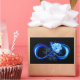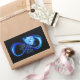 Luminous infinity symbol with glowing, beautiful, lushly blooming rose made of blue flames on black background.