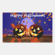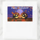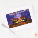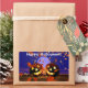 Duas abóboras brincalhão na noite de Halloween são iluminadas com risos com uma lua de cheio atrás delas e folhas de queda voadoras. Com texto personalizável "Feliz Dia das Bruxas!"