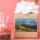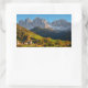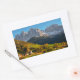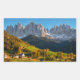 Um autocolante de fotografia retangular com a pequena aldeia Sankt Magdalena, com a igreja proeminente cercada por árvores de cor no outono, em frente aos picos altos da montanha Dolomites, na última luz do dia, no vale de Villnöss (Funes), no Tirol do Sul, Itália.