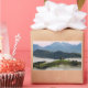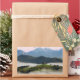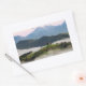 Um autocolante de fotografia de souvenir retangular, com a igreja de Ruas, Thomas (Sveti Tomaž), numa colina rodeada por nevoeiro matinal no interior da Eslovênia, perto de Skofja Loka, durante um nascer de sol rosa, com montanhas alpinas ao fundo.
