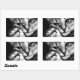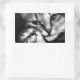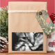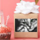 Fotografia branca e preta de um gato com olhos verdes abraçando um gatinho adorável.