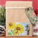Pintura de aquarela original de Sandra Gale, com um grupo de girassóis e um saco de jardineiro, chapéu e pá. design de excelente para jardineiros de todos os tipos e uma imagem perfeita do verão!