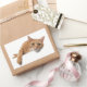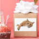 Retrato de uma taça laranja de taça doméstica de gato deitado sobre um fundo branco com pata cortada sobre uma mesa