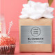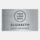 Adesivo de etiqueta de nome profissional com o logotipo da sua empresa, negócio ou organização contra um fundo metálico falso prateado fosco. Adicione um nome e cargo/posição em tipografia simples.