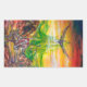 Pintura acrílica colorida e vibrante em verde, amarelo alaranjado, roxo, castanho vermelho, cores brancas de 2009, Duelo entre Bradamant e Negromcer em seu grifão com asas enormes. Orlando Furioso, Canto 2 escrito pelo poeta Renascentista italiano Ludovico Ariosto 1516 .