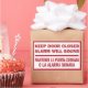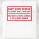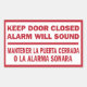 Sinal de aviso de Mantenha a Porta Fechada em Inglês e Espanhol: KEEP DOOR CLOSED ALARM WILL; MANTENER LA PUERTA CERRADA O LA ALARMA SONARA em negrito tipo vermelho em fundo branco para chamar a atenção.