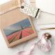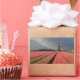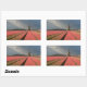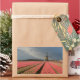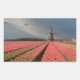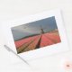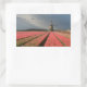 Um autocolante de fotografia retangular de uma paisagem com um moinho de vento e flores de tulipas cor-de-rosa em filas numa fazenda de bolbo sob um céu de cinza no campo dos Países Baixos em primavera.