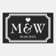 Retângulo preto e monograma branco favorece adesivos. Coração bonito com nomes monográficos de noiva e noiva e data do casamento. Obrigado personalizado que você cola ou sela/sela de envelopes. Tipografia elegante para noiva e noivas. Design de borda chic / design de rico. Cor de fundo personalizável. Design do tema do amor romântico.