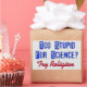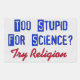É hora de lutar contra os fanáticos religiosos que querem negar a Ciência a favor da superstição. Em letras azuis "Muito estúpido para a ciência?" respondeu em letras vermelhas "Tente a religião."