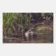 Um Pato Mallard flutua num lago. Ao se abrigar pelas plantas altas que crescem à beira da água, fecha os olhos. Esta seção da lagoa está tranquila, e pacífica, longe dos outros patos. Copyright Kimberly J Tilley.