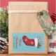 A ilustração original de Destei de uma meia festiva vermelha de Natal que tem duas canas doces saindo dela. A cor de fundo é azul. Há também duas áreas de texto personalizáveis.