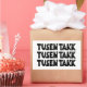 Lino preto e branco digitalizado cortou impressão de letra dizendo "Obrigado" em norueguês ("Tusen Takk").