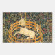 Vinhetas com tapeçaria medieval O Unicórnio em cativeiro (1495-1505). A sétima tapeçaria no The Unicorn Tapestries - também conhecida como The Unicorn Rest in a Garden - mostra um unicórnio branco com um colarinho azul sentado dentro a cerca. A grama verde e lindas flores rodeiam o unicórnio. Um presente fantástico para colecionadores de arte medievais e amantes da fantasia!