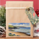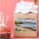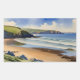 "Onde O Céu Encontra Areia Silenciosa" - Devon Seascape. Um retrato sonhador de Devon, Inglaterra, pintado em tons estilizados de cor d'água de azul-do-mar, bege arenoso e verde-prado. Esta paisagem marítima captura o suave silêncio da maré matinal e céu aberto, convidando o espectador a um momento tranquilo de conexão com a paisagem costeira.