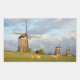 Um adesivo fotográfico com três moinhos de vento e ovelhas olhando para dentro da câmera sob lindas nuvens no céu, numa bela paisagem de primavera no campo na Holanda.