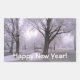 Foto de um caminho que leva a uma paisagem fosco de inverno. Texto: Feliz ano novo!