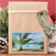 Um autocolante de fotografia retangular de uma palmeira na praia de areia de um luxo sobre-água que resort lua de mel na ilha tropical Bora Bora, perto de Tahiti, no arquipélago pacífico Polinésia Francesa.