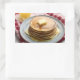 Esta é uma imagem gerada por IA. eu queria ter a pilha de panquecas com uma parte de manteiga e coberta de xarope. Supus que pessoas bebessem suco de laranja com panquecas.