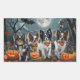 Libere o espírito assustador com esta design sombria do Dia das Bruxas apresentando um bando de cachorros sob um céu escuro e iluminado, cercado por morcegos voadores e abóboras brilhantes. Perfeito para aqueles que amam um toque de diversão terrível com seus amigos peludos!