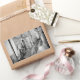 Um adesivo de fotografia retangular com um patinete vintage estacionado em frente a uma casa em uma rua de pedra calcada em uma cidade na Itália, a preto e branco na moda.