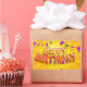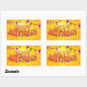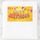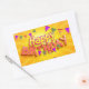 Texto feliz de aniversário em negrito e divertido, com cores roxas e laranja cercadas por decorações coloridas definidas sobre um fundo amarelo brilhante.