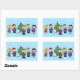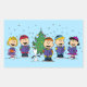 This rectangular Peanuts sticker features a joyful holiday scene with a light blue background and falling snow. The entire Peanuts Gang—including Snoopy in the snow—is gathered together, bundled up in winter hats and scarves, and happily caroling. Each human character holds an open book with a purple sheet of music. A classic, decorated Christmas tree stands between them. This officially licensed sticker is a cheerful, nostalgic piece of seasonal merchandise, perfect for decorating gifts, sealing holiday cards, or celebrating the holiday season with the classic charm of the whole Peanuts family.