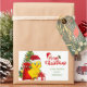 Bela animação de galinha com olhos azuis, chapéu de Natal, saco com presentes e com presente de Natal. Na parte de trás, uma adorável árvore de Natal com um roteiro de caligrafia Feliz Natal com elementos de Natal. Personalize alterando ou excluindo o texto, adicione um nome e seu próprio desejo. Feliz Feriados!