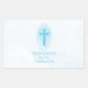 Numa Primeira Comunhão Sagrada, um círculo rodeia o centro da cruz que representa o hospedeiro. Rays estão saindo do centro dando um sentimento alegre neste presente azul de parabéns da Primeira Comunhão, lembrança, doação e festa essenciais para um garoto!