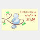 Esse bebezinho doce diz que você é uma estrela! Um design delicioso mostra uma ilustração de um pássaro azul gordinho sentado em um galho cantando. O texto pode ser alterado de acordo com as suas necessidades usando o modelo fornecido. Perfeito como um adesivo de prêmio para um bom trabalho ou reconhecimento de conquista.