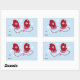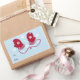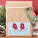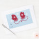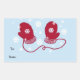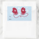 Um belo par de luvas de férias vermelhas com uma corda vermelha e um design de floco de neve. Um fundo de azul com flocos de neve brancos.