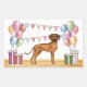 A ilustração original do desenho animado de Destei de um cão Ridgeback da raça Ridgeback. O cão é colocado num ambiente de aniversário colorido com balões de aniversário de cor pastel, presentes e uma faixa de bunting. As cores pastel incluem rosa, verde, azul, vermelho, laranja e roxo. O cachorro está parado sobre uma textura amarela de chão de madeira e o fundo tem um padrão de bolinhas pastel lúcido.